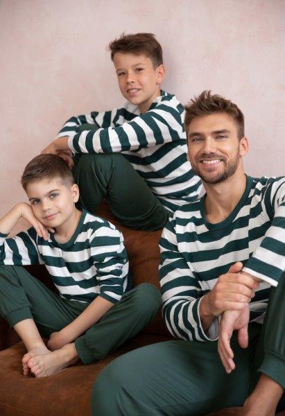 Dětské pyžamo má pruhované triko s dlouhým rukávem a jednobarevné tmavě zelené kalhoty zakončené nápletem.