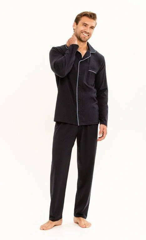 Elegantní pánské propínací pyžamo z úpletového materiálu s příměsí elastanu. Horní díl má kapsu a je ozdobený paspulí, kalhoty mají v pase širokou gumu a rovné nohavice.
