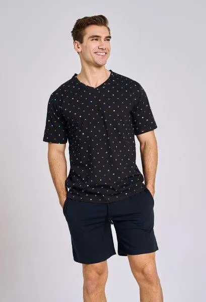 Pánské pyžamo s krátkým rukávem má triko z potištěného materiálu, výstřih do V. Jednobarevné kalhoty mají v pase širokou gumu, vázačku a 2 kapsy.