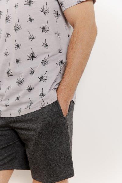 Pánské pyžamo s krátkým rukávem má antracitové kalhoty s kapsami s příměsí elastanu a širokou gumu. Potištěné bavlněné triko má kulatý výstřih.