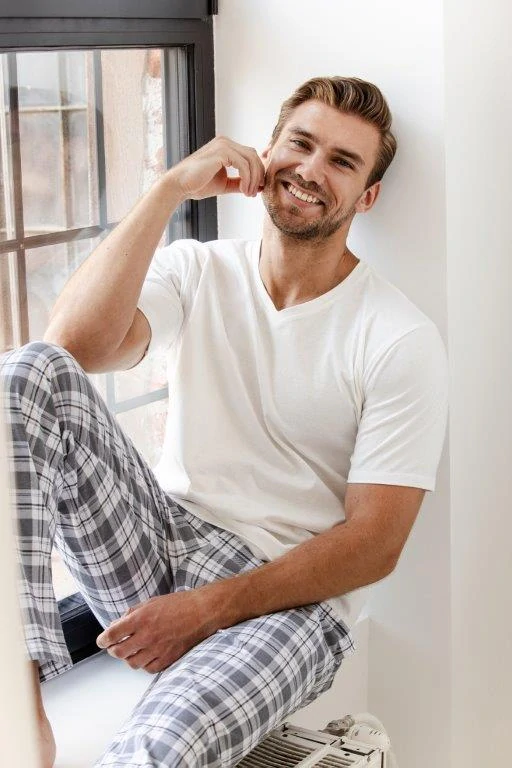 Pánské pyžamo má jednobarevné triko s krátkým rukávem a výstřihem do V. Dlouhé kostkované kalhoty mají v pase širokou guma a dvě kapsy.
