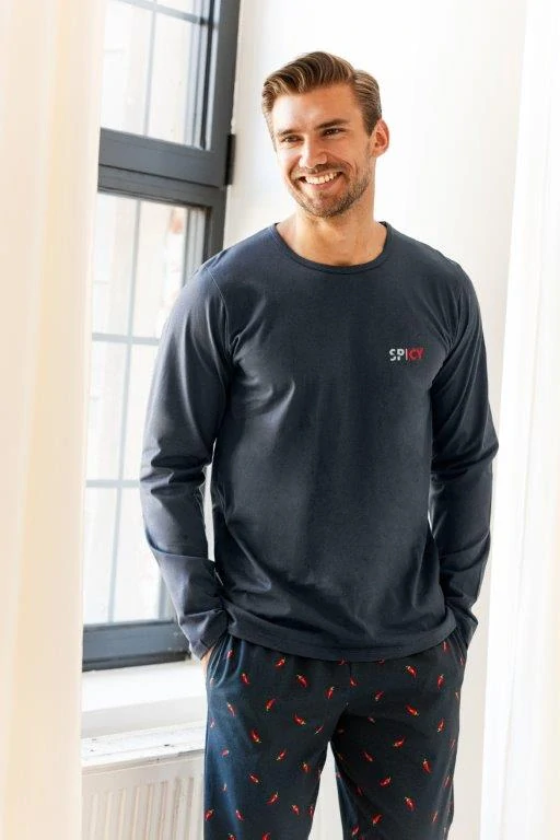 Pánské pyžamo s dlouhým rukávem má jednobarevný horní díl ozdobený malým tiskem. Kalhoty z potištěného materiálu mají 2 kapsy, v pase širokou gumu a jsou zakončeny nápletem.