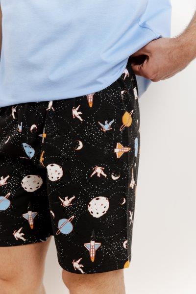 Pánské pyžamo s krátkým rukávem má světle modré triko s kulatým výstřihem, ozdobené jemným tiskem. Potištěné kalhoty mají širokou gumu v pase.