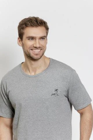 Pánské pyžamo s krátkým rukávem má šedé melírované triko ozdobené malým tiskem a kulatý výstřih. Kostkované kalhoty mají v pase širokou gumu.